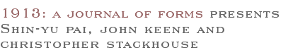 Shin Yu Pai is the author of several poetry books, including most recently Works on Paper (Convivio Bookworks) and Sightings: Selected Works [2000 - 2005] (1913 Press, 2007). Forthcoming projects include Haiku Not Bombs from the Booklyn Artists Alliance. Her work is anthologized in America Zen: A Gathering of Poets (Bottom Dog Press, 2004) and The Wisdom Anthology of North American Buddhist Poetry (Wisdom Publications, 2005). She has exhibited her visual work at The Dallas Museum of Art, The Paterson Museum, and the Three Arts Club of Chicago. She lives in the Pacific Northwest, where she is a predoctoral student in Sociocultural Anthropology and Museology at the University of Washington. website: http://shinyupai.com